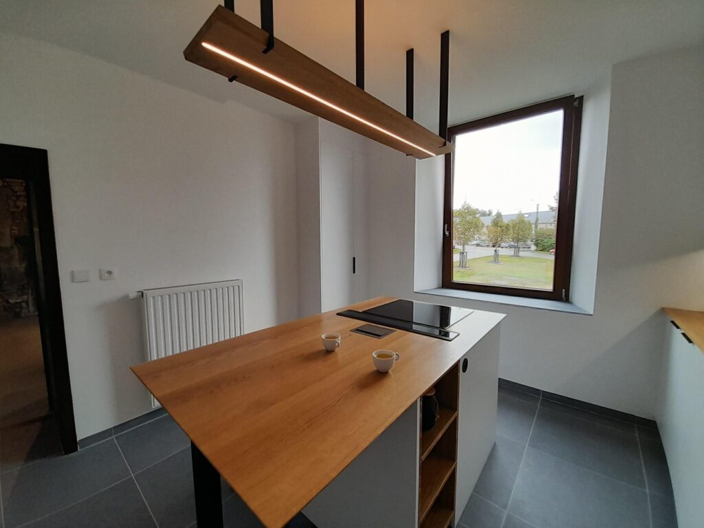 Nos plans de travail sont réalisés en placage de bois massif plaqué sur un support technique de haute qualité, adapté aux contraintes des cuisines et aménagements sur mesure.